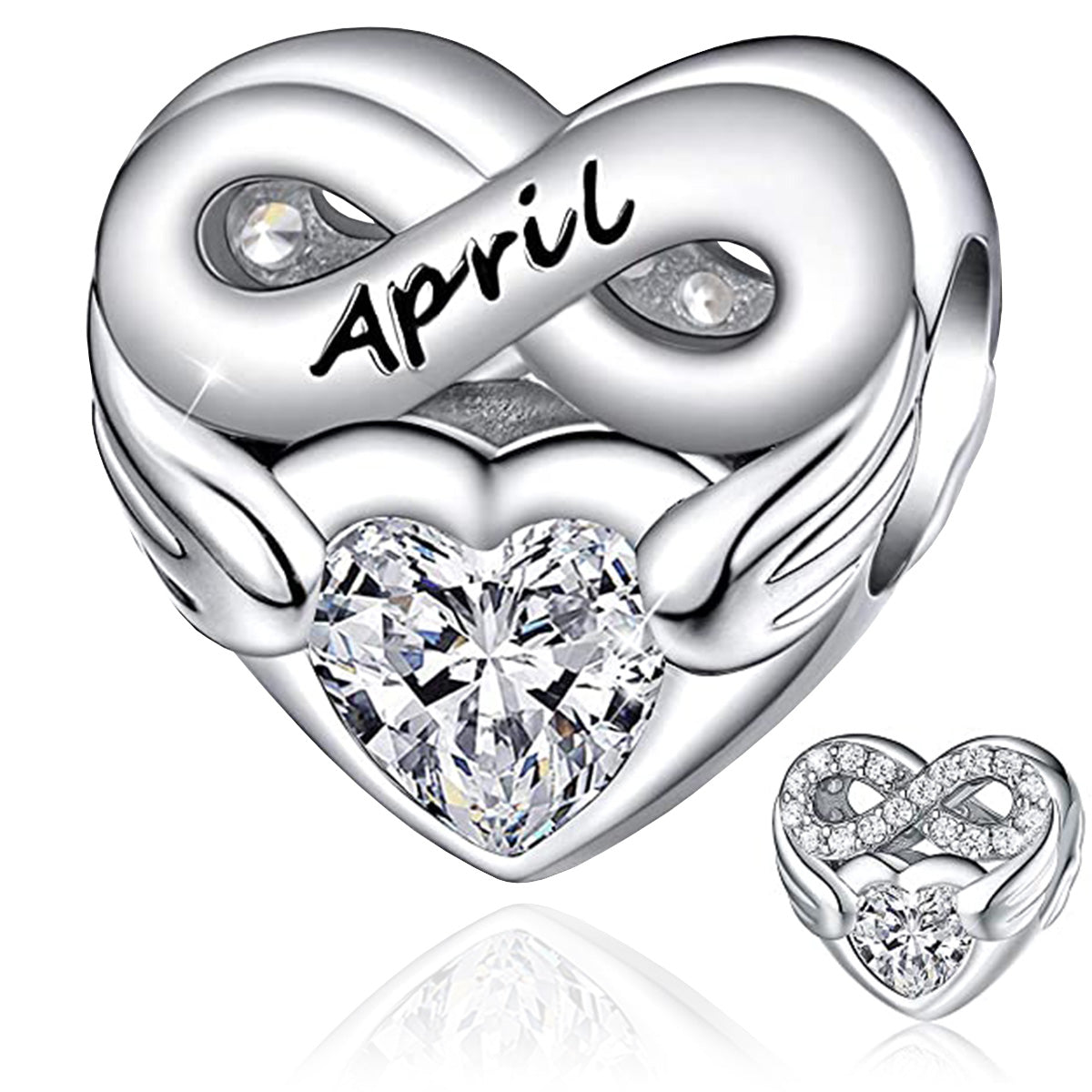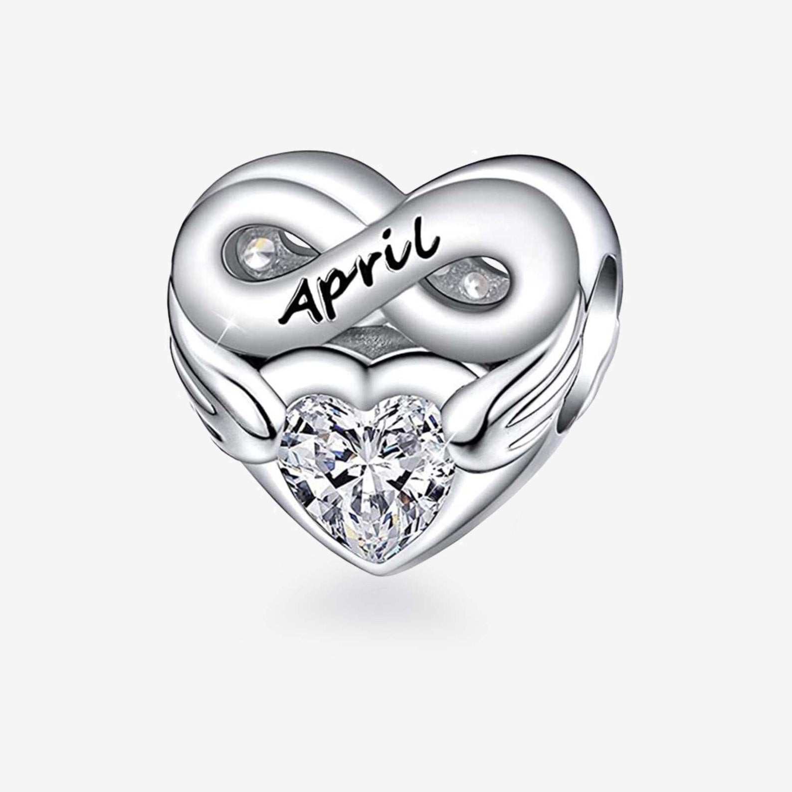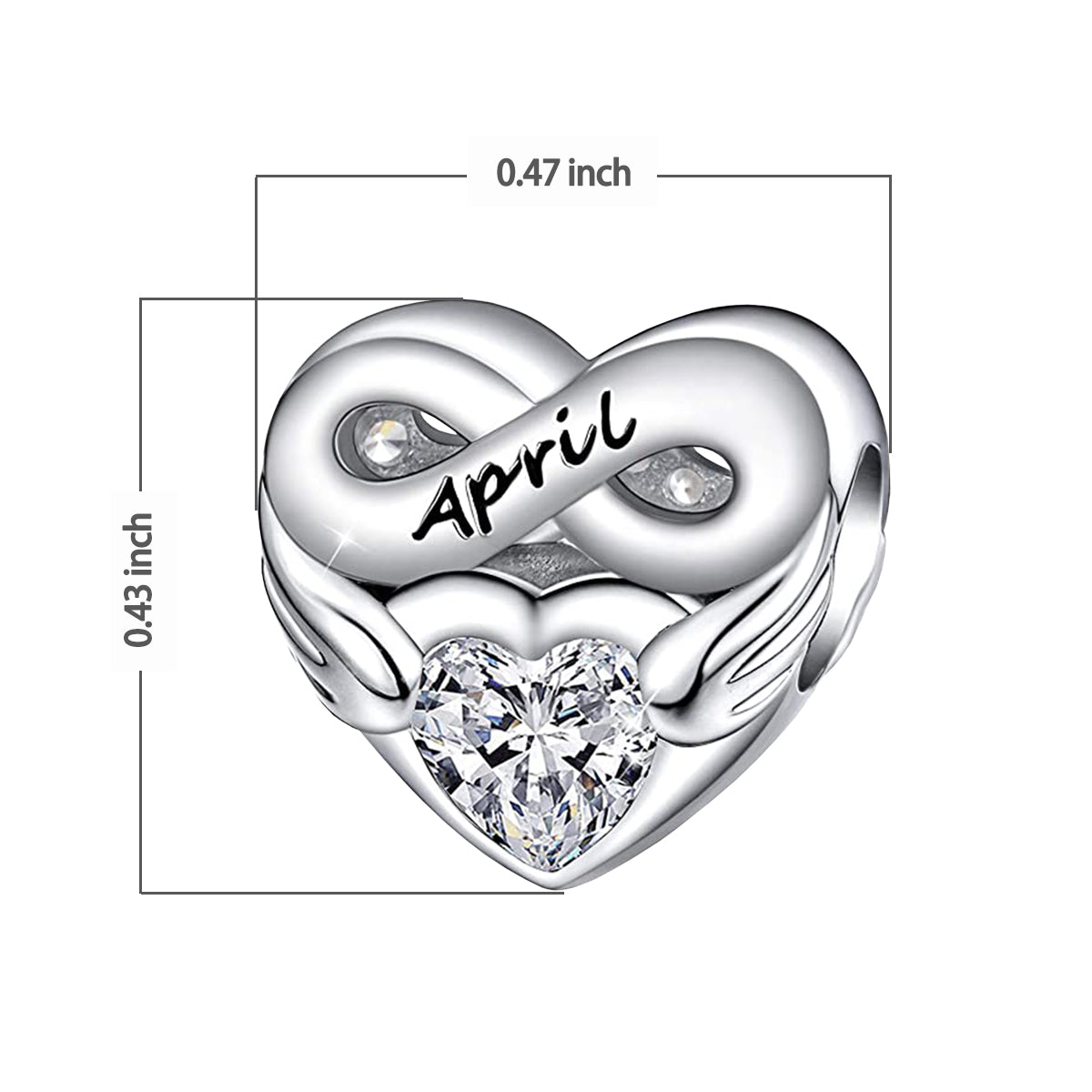 April Birthstone Months Heart Charm for Bracelet, S925 Sterling Silver