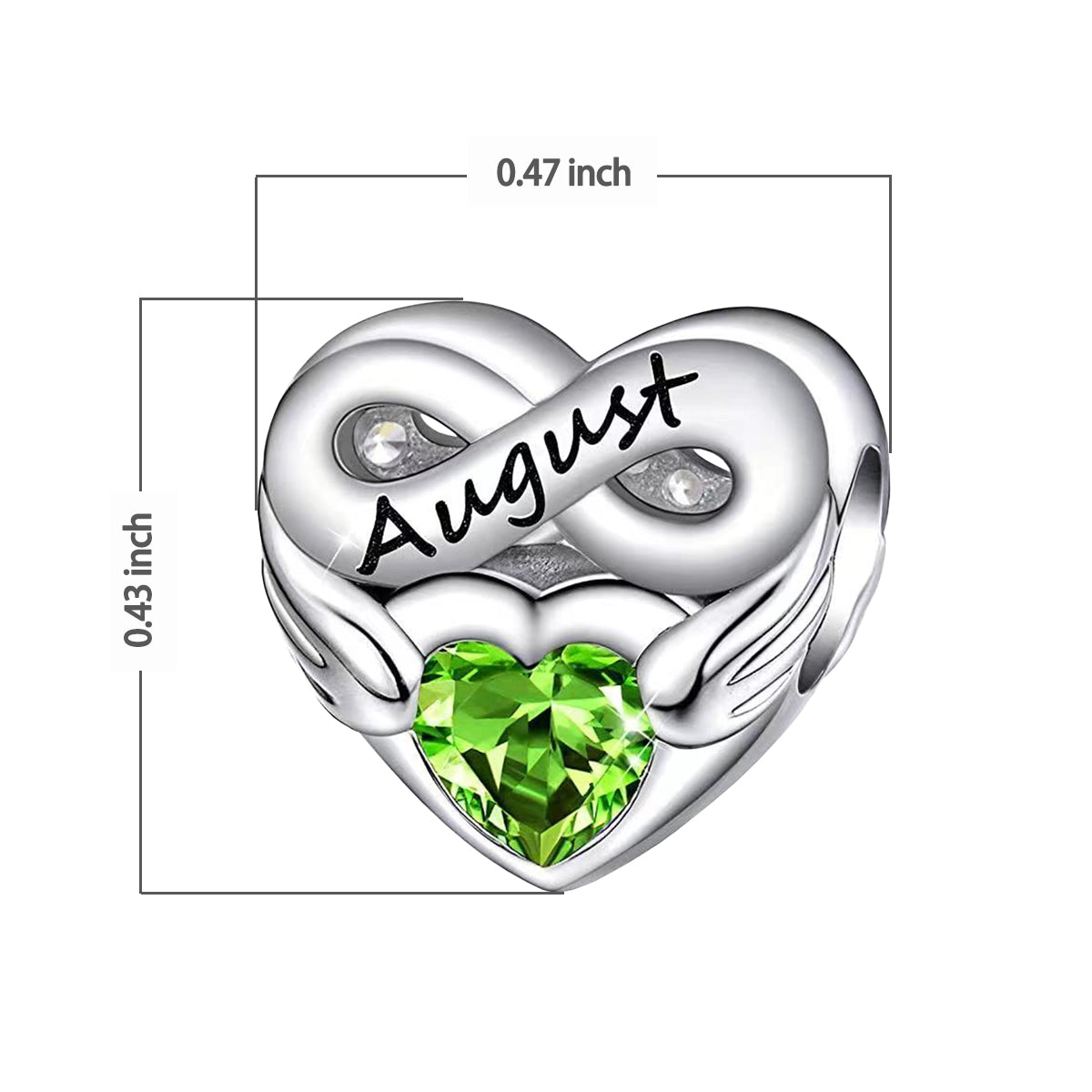 August Birthstone Months Heart Charm for Bracelet, S925 Sterling Silver