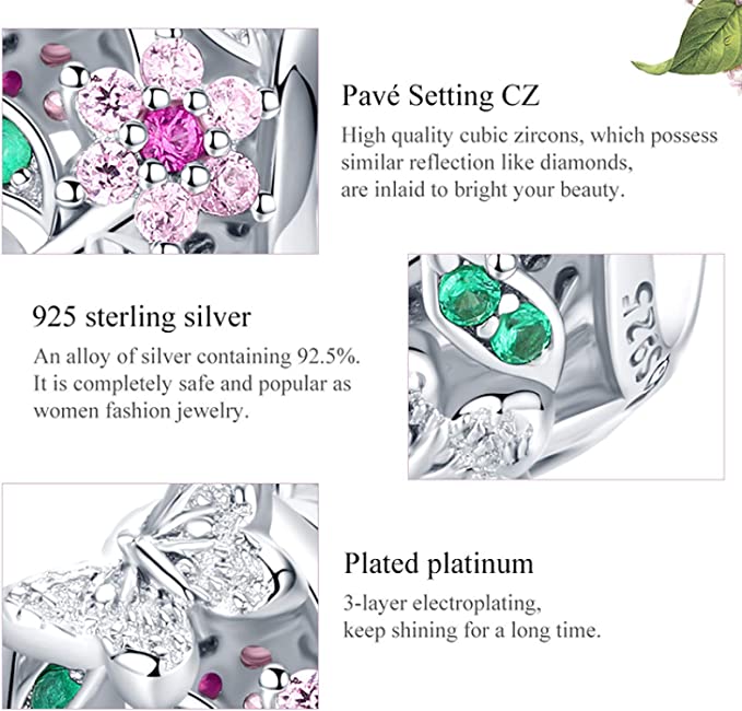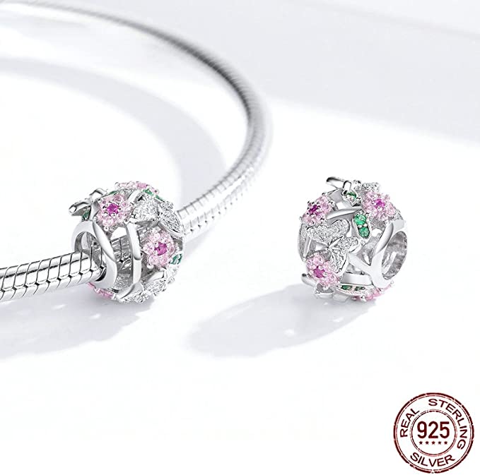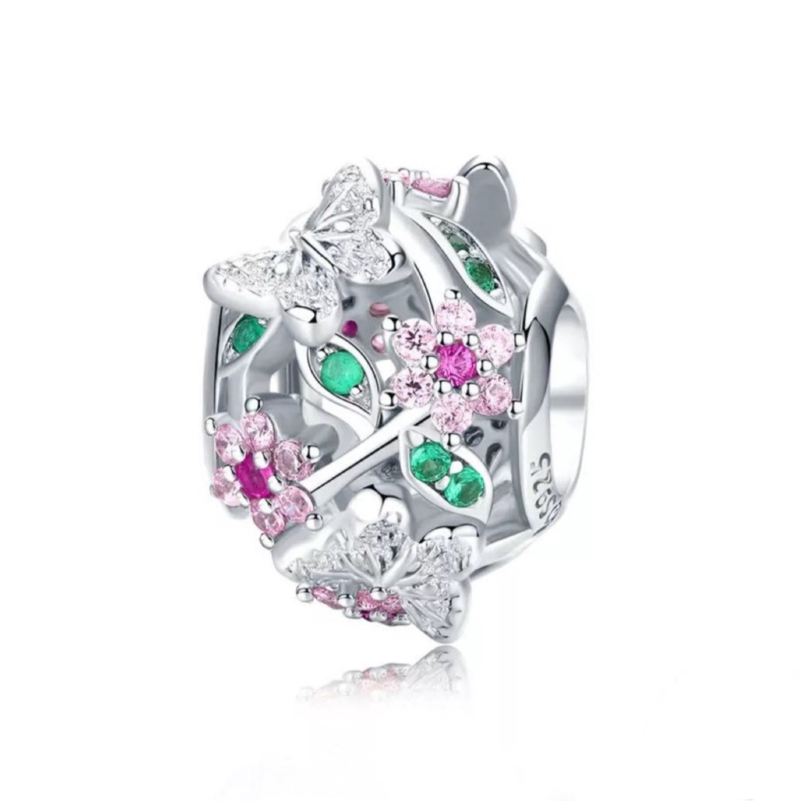 Butterfly In Garden Flower Charm for Bracelet, S925 Sterling Silver