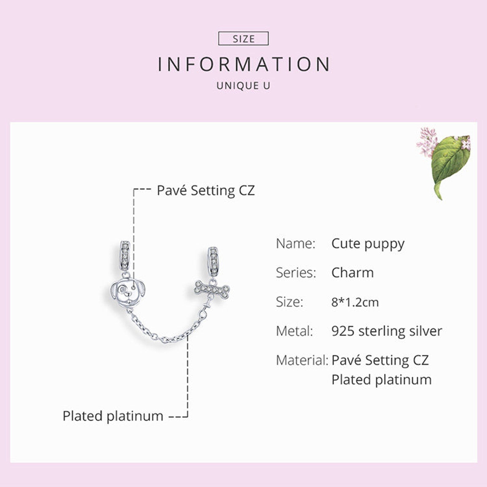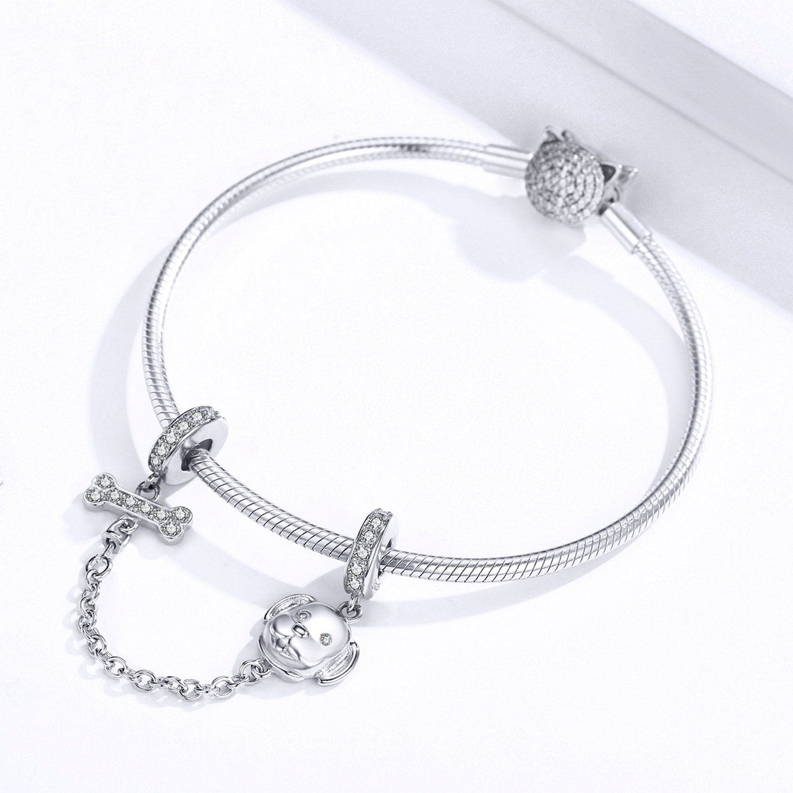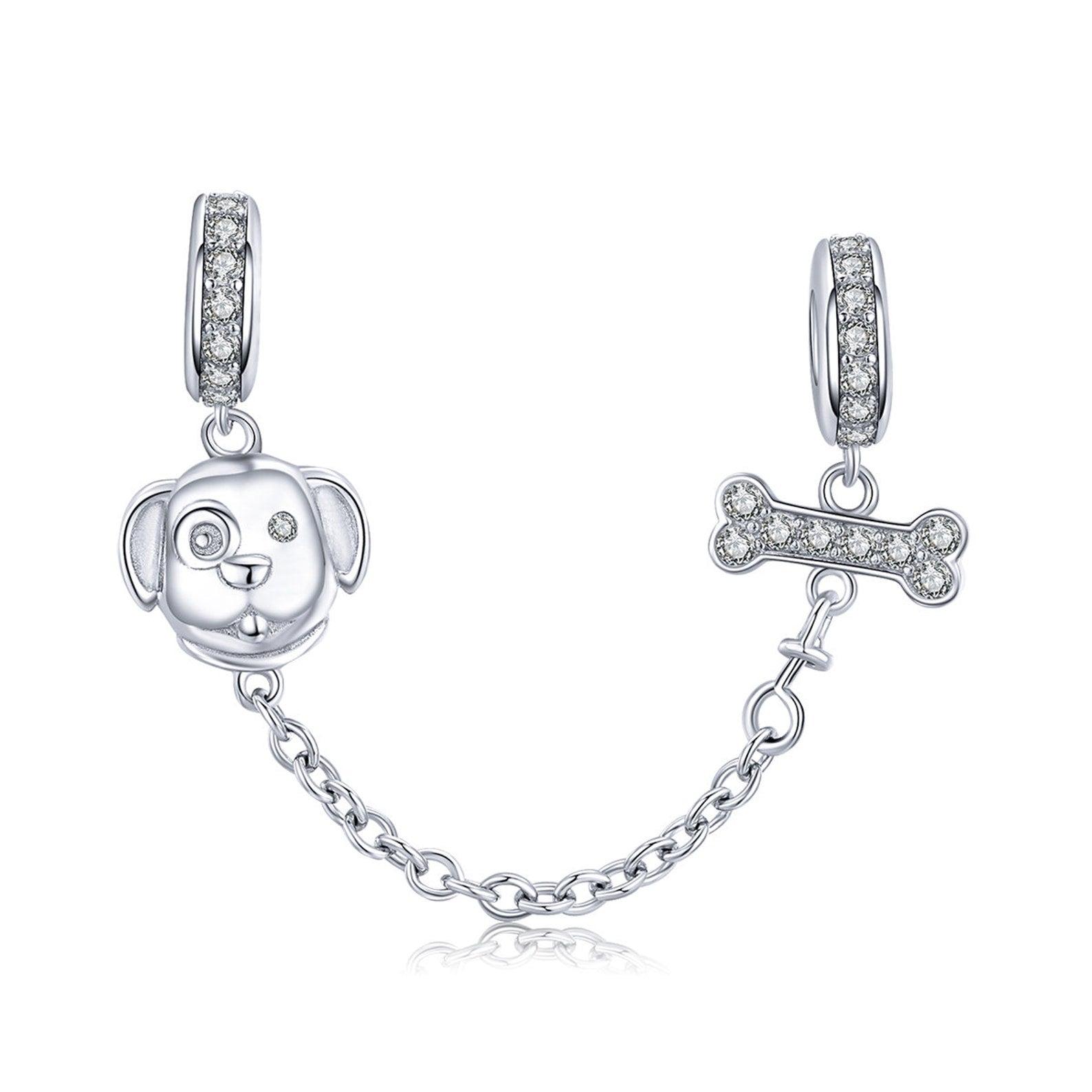 Dog and Bone Safety Chain Charm for Bracelet, S925 Sterling Silver