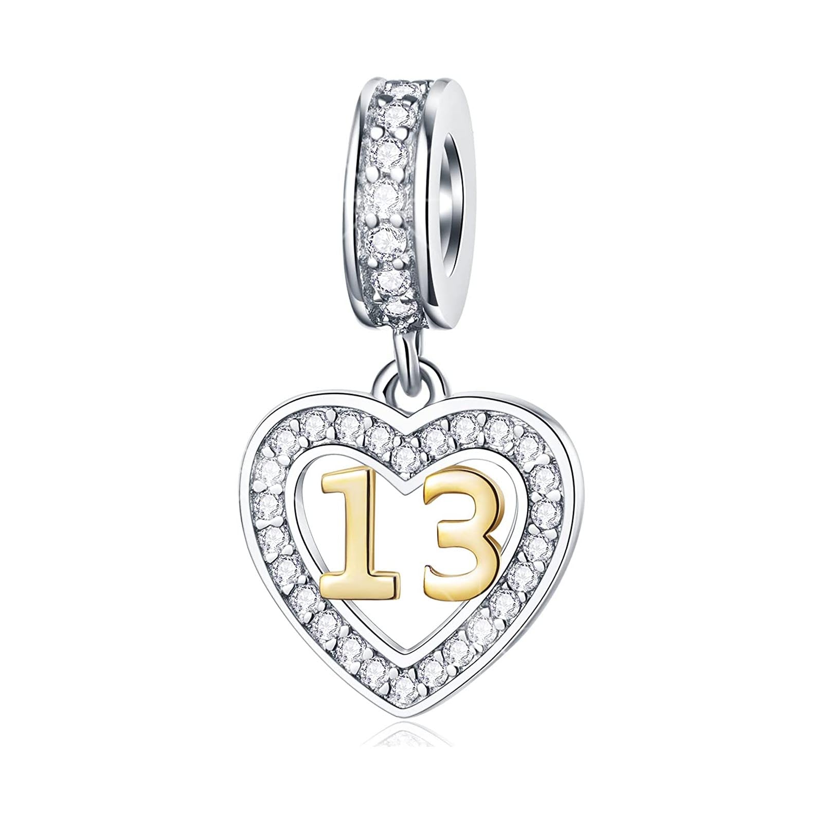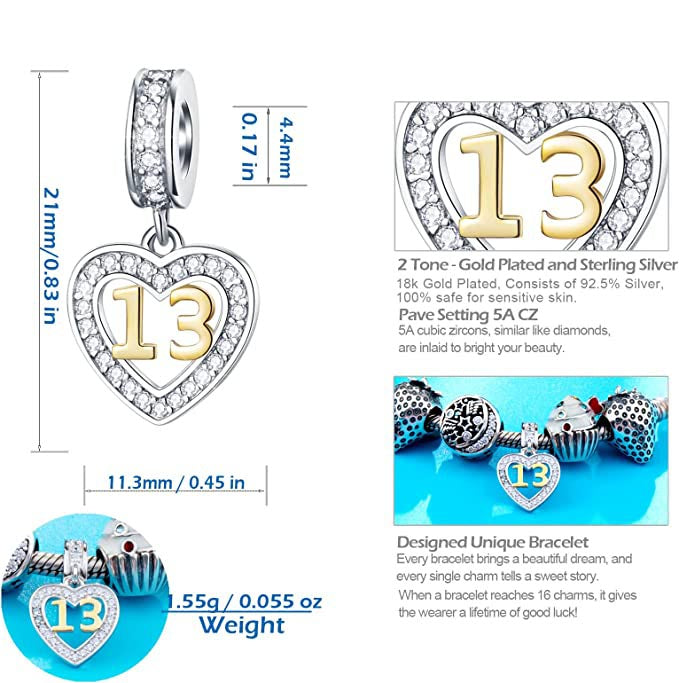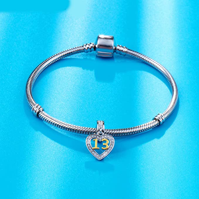 Golden 13th Birthday Number Dangle Charm for Bracelet, S925 Sterling Silver