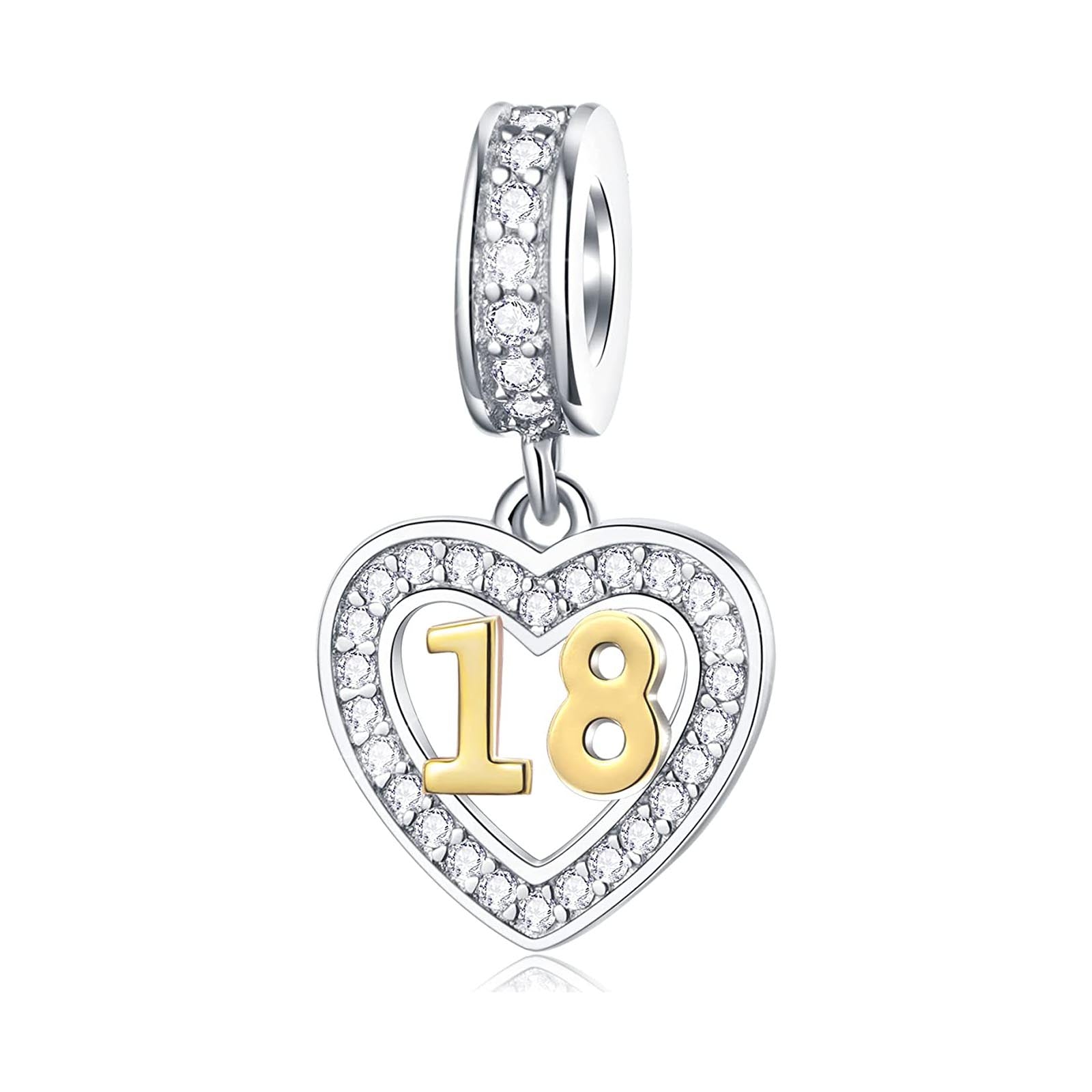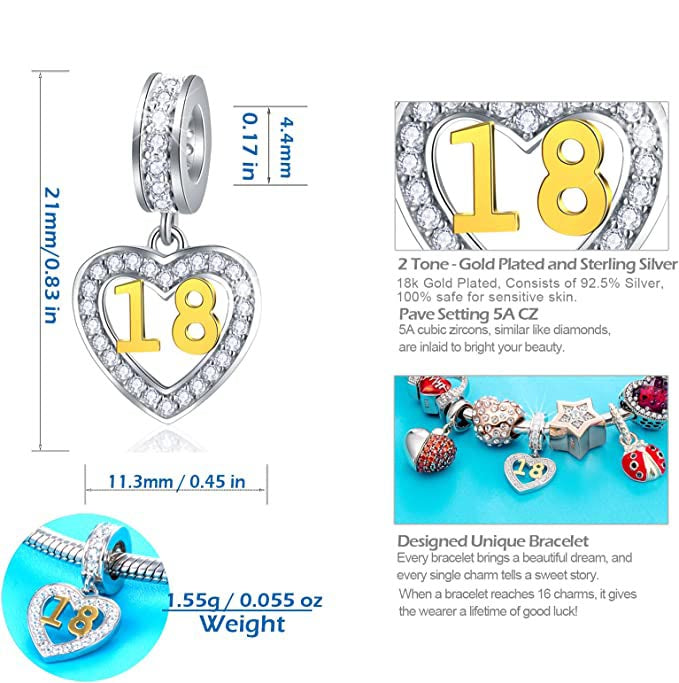 Golden 18th Birthday Number Dangle Charm for Bracelet, S925 Sterling Silver