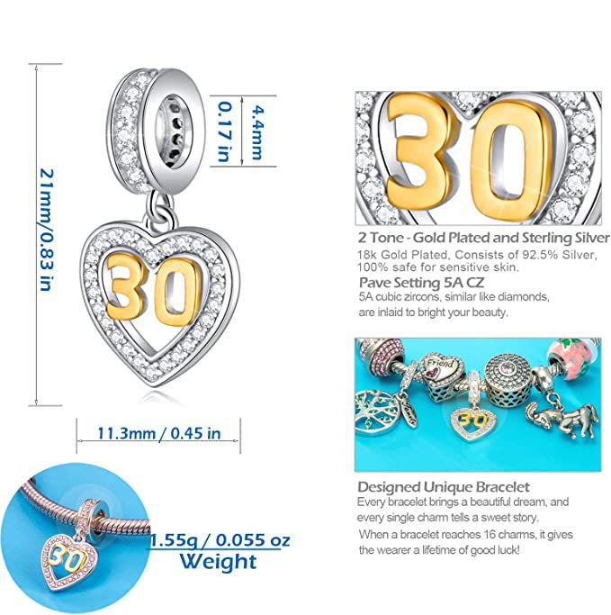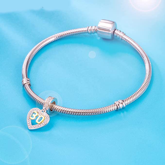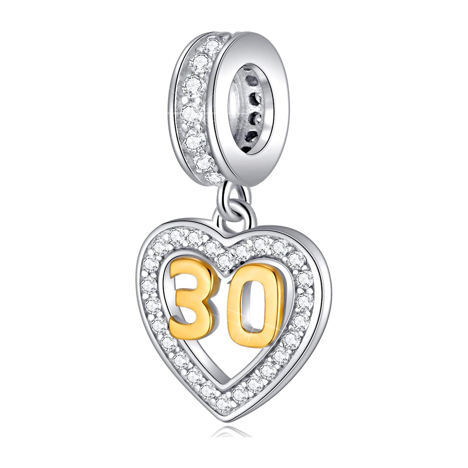 Golden 30th Birthday Number Dangle Charm for Bracelet, S925 Sterling Silver