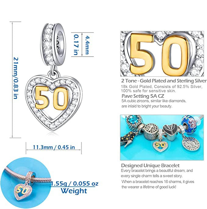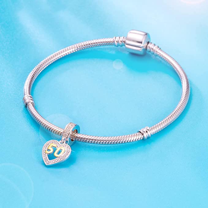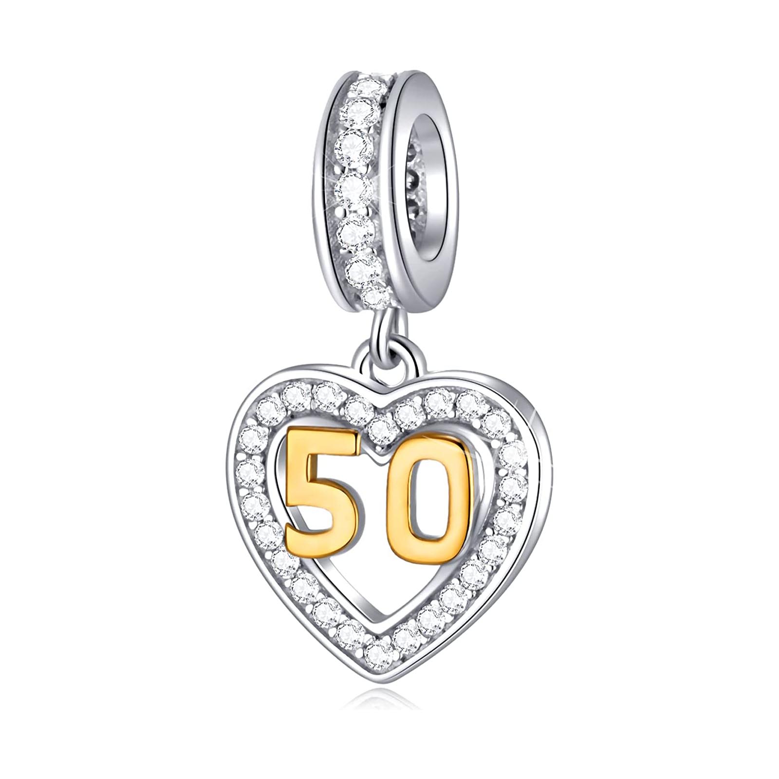 Golden 50th Birthday Number Dangle Charm for Bracelet, S925 Sterling Silver