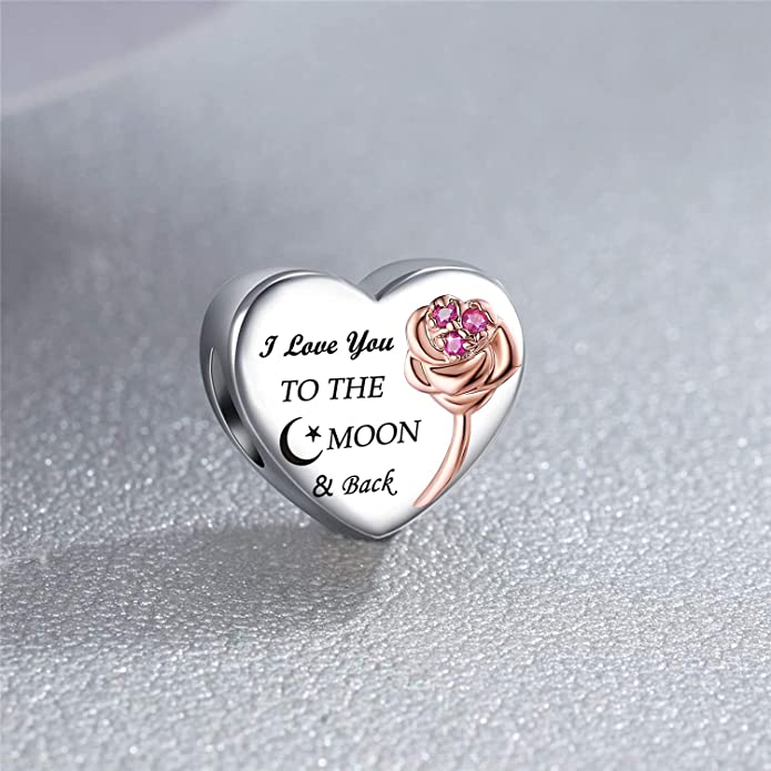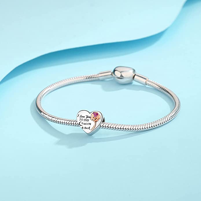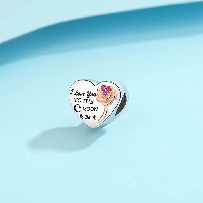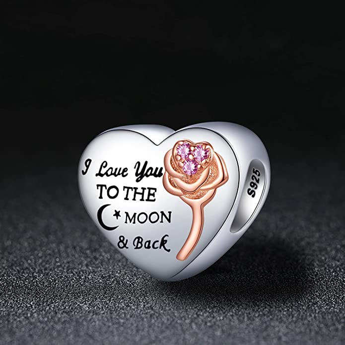 I Love You to The Moon and Back Heart Charm for Bracelet, S925 Sterling Silver