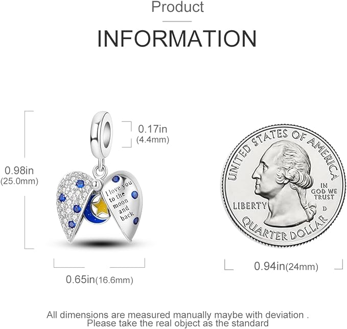 I Love You to the Moon and Back Openable Heart Charm for Bracelet, S925 Sterling Silver