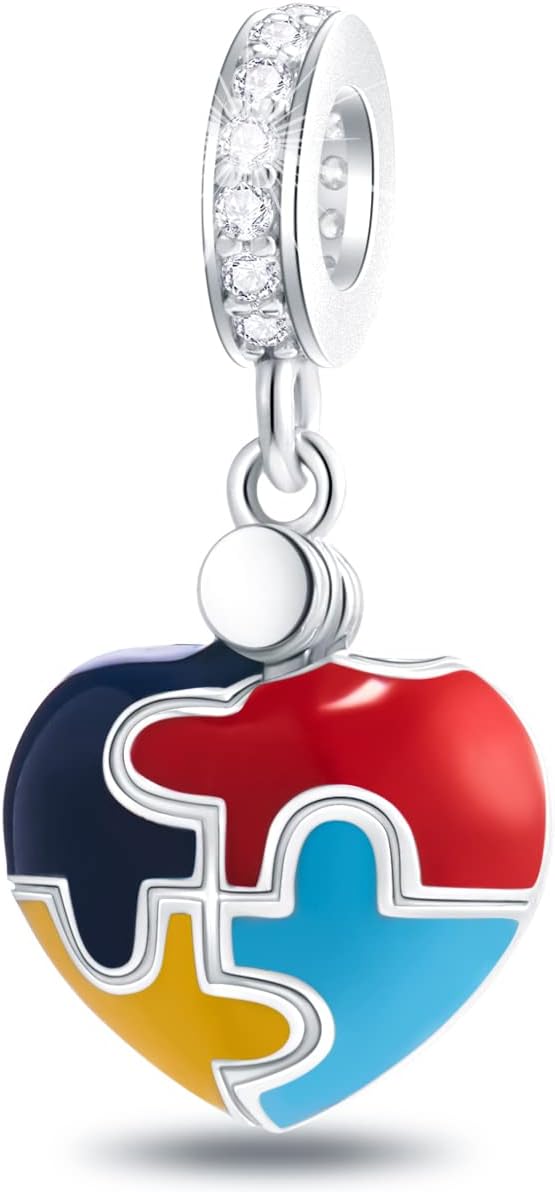 Love Heart Autism Puzzle Charm for Bracelet, S925 Sterling Silver
