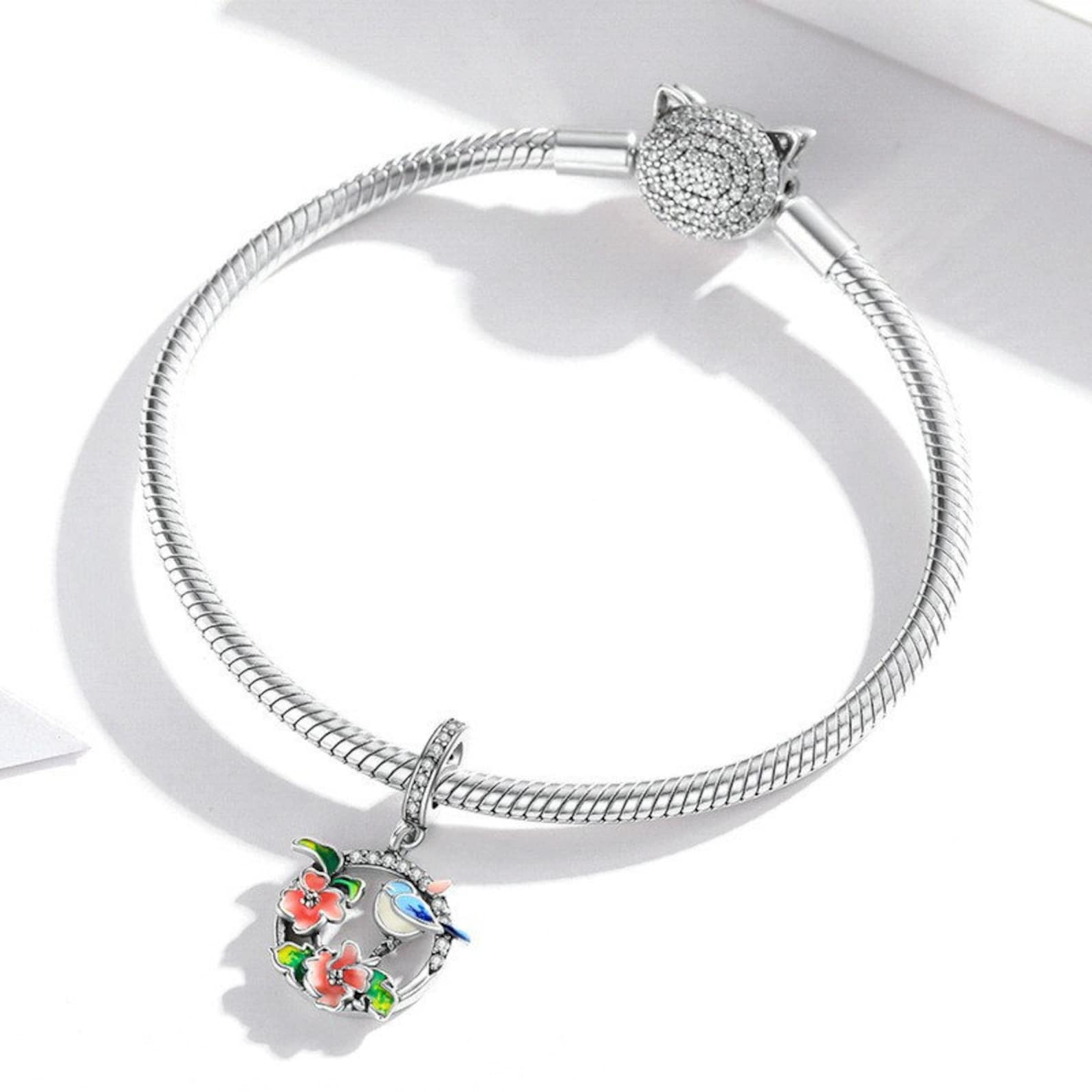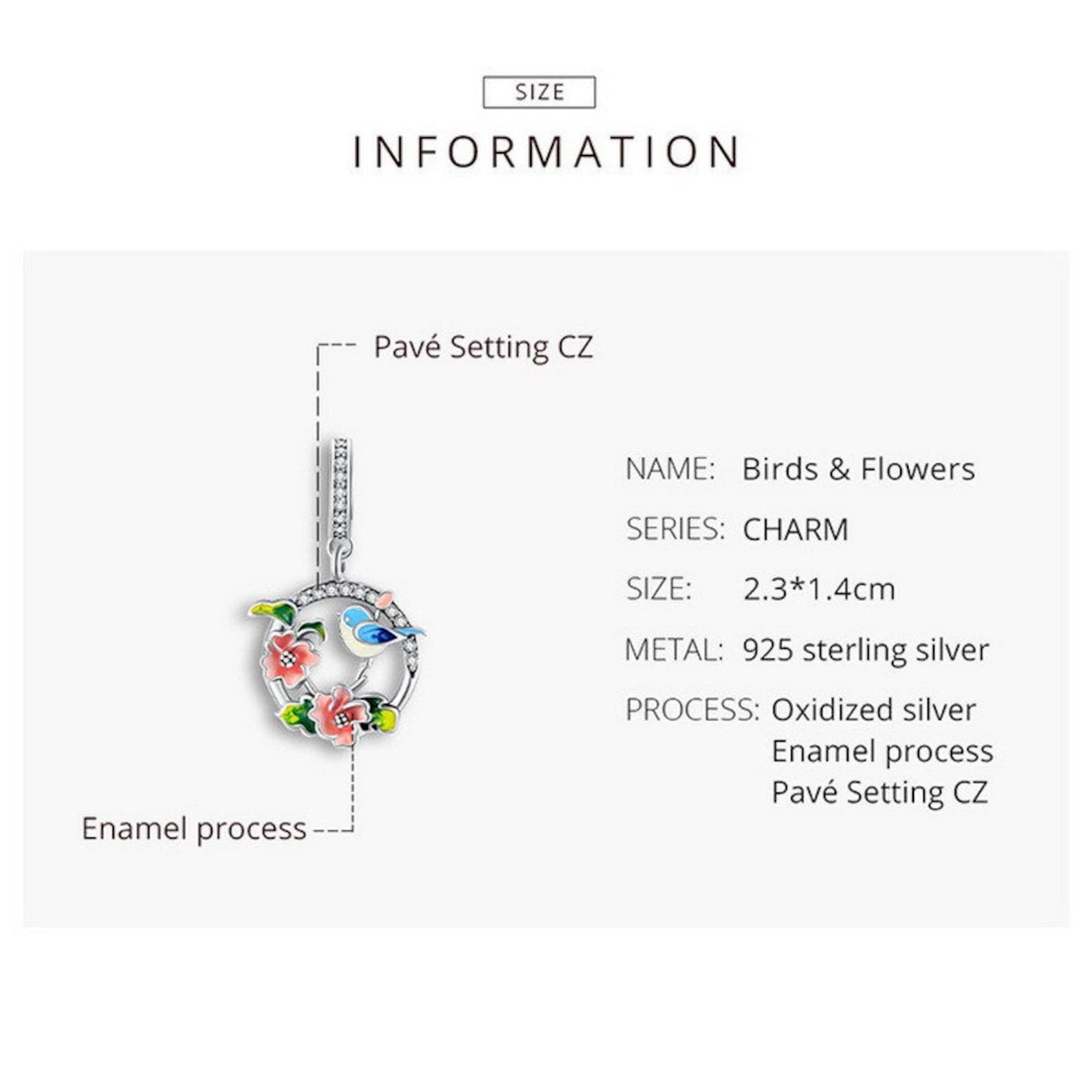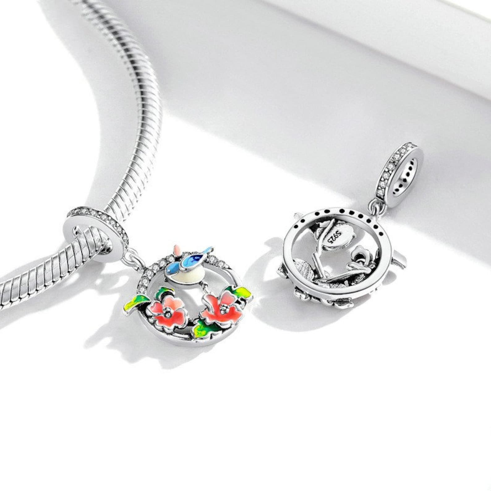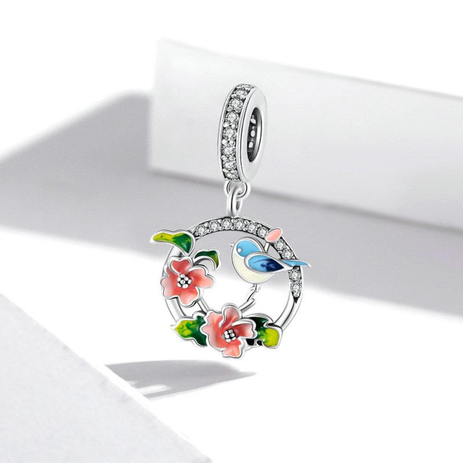 Multicolor Bird & Flowers CZ Pendant Charm for Bracelet, S925 Sterling Silver