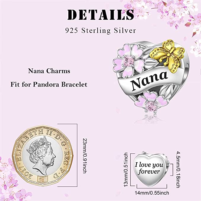 Nana Flower & Butterfly Heart Charm for Bracelet, S925 Sterling Silver