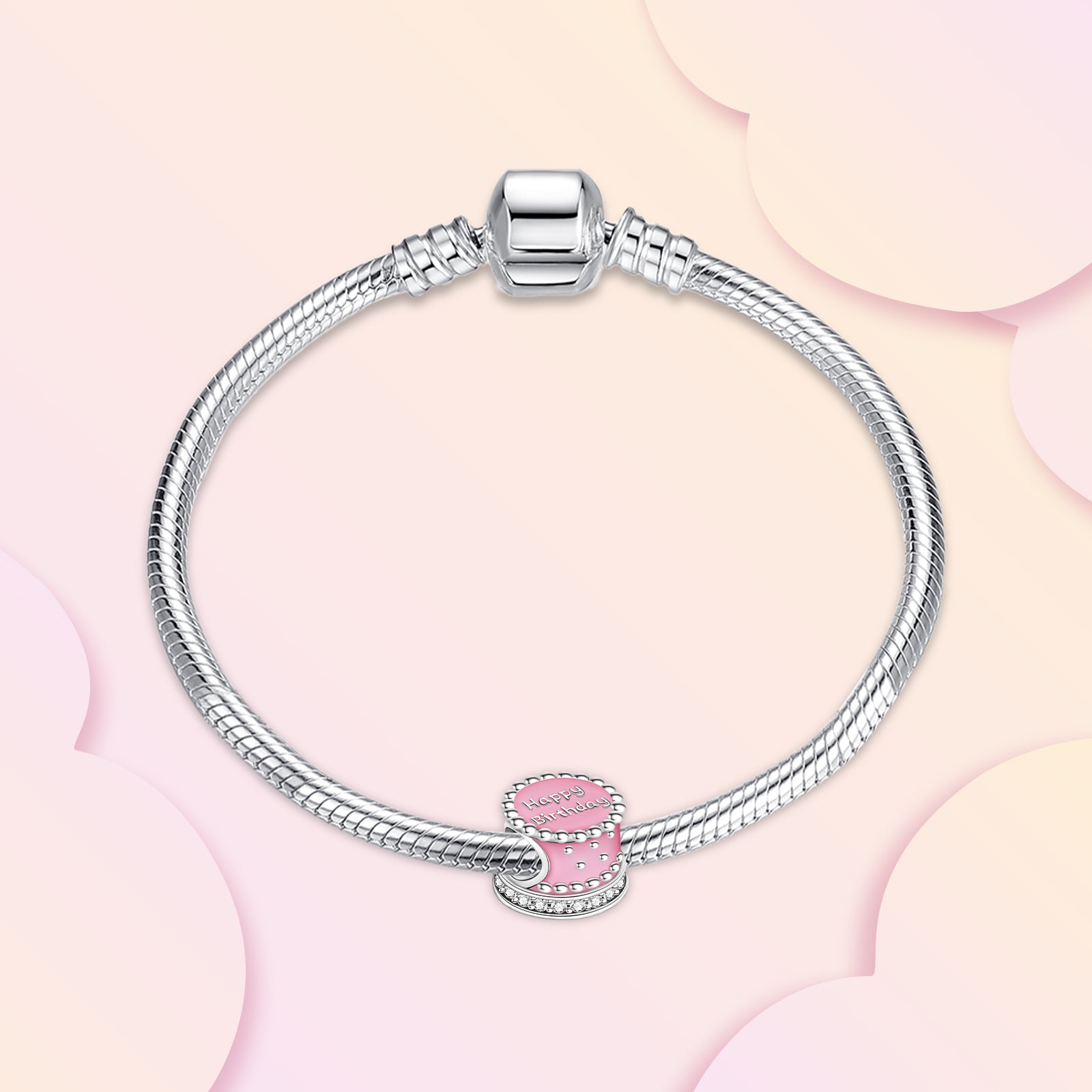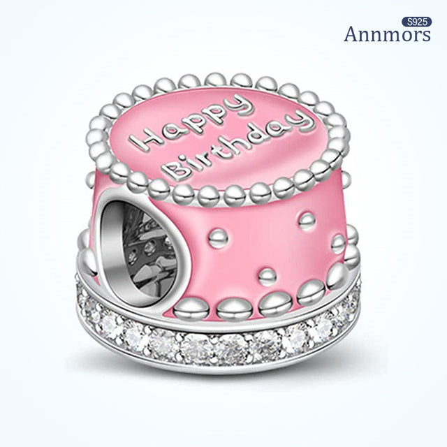Pink Happy Birthday Cake Charm For Bracelet, S925 Sterling Silver