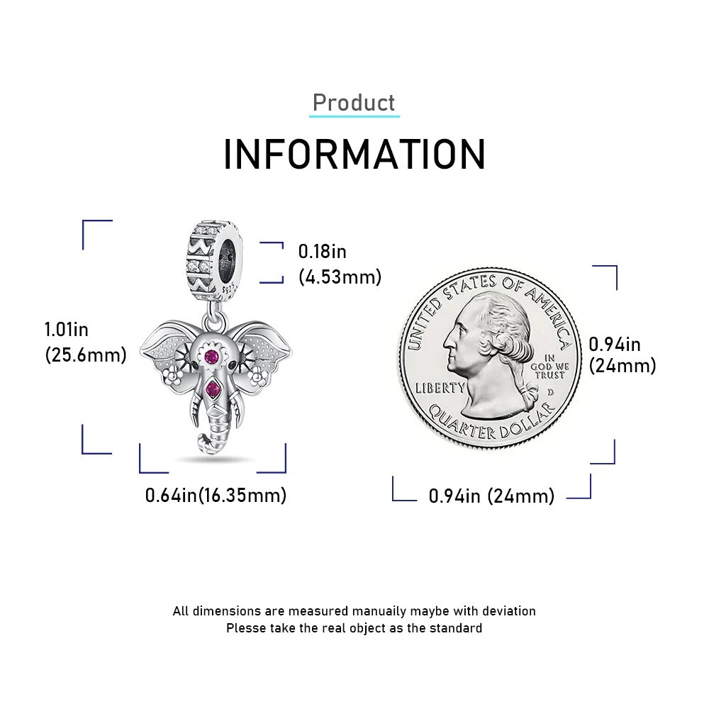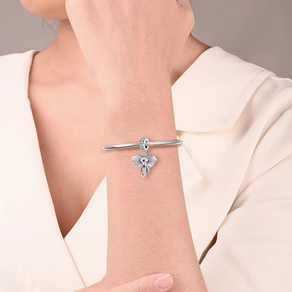 Pink Stone Elephant Dangle Charm for Bracelet, S925 Sterling Silver