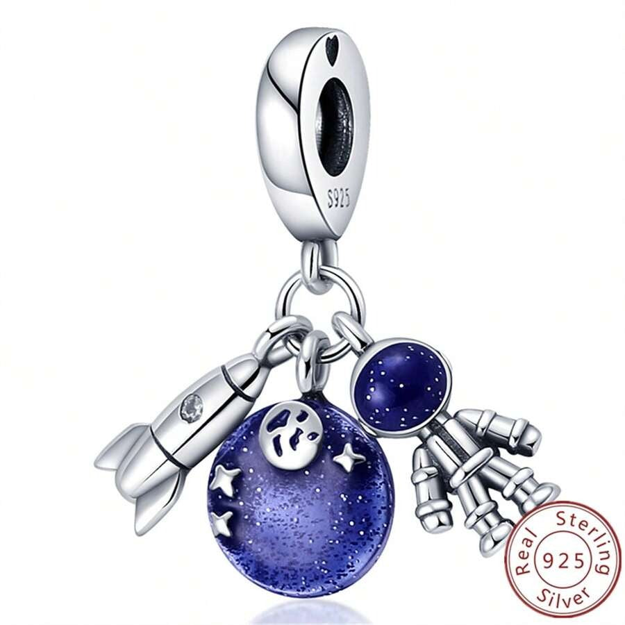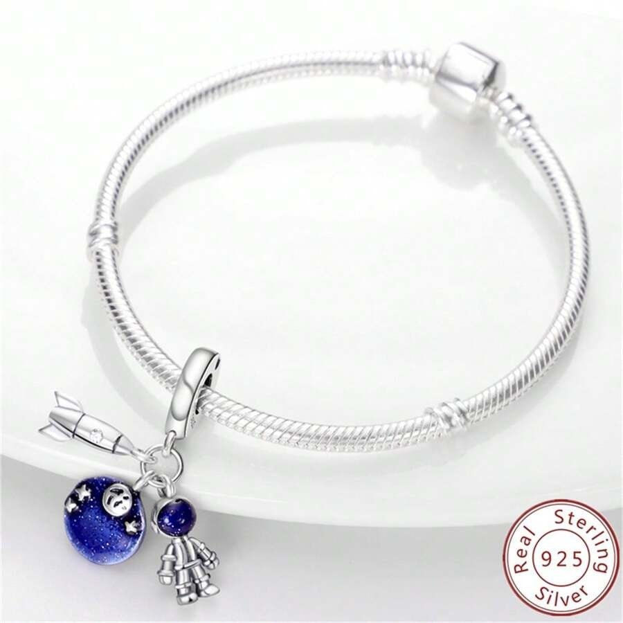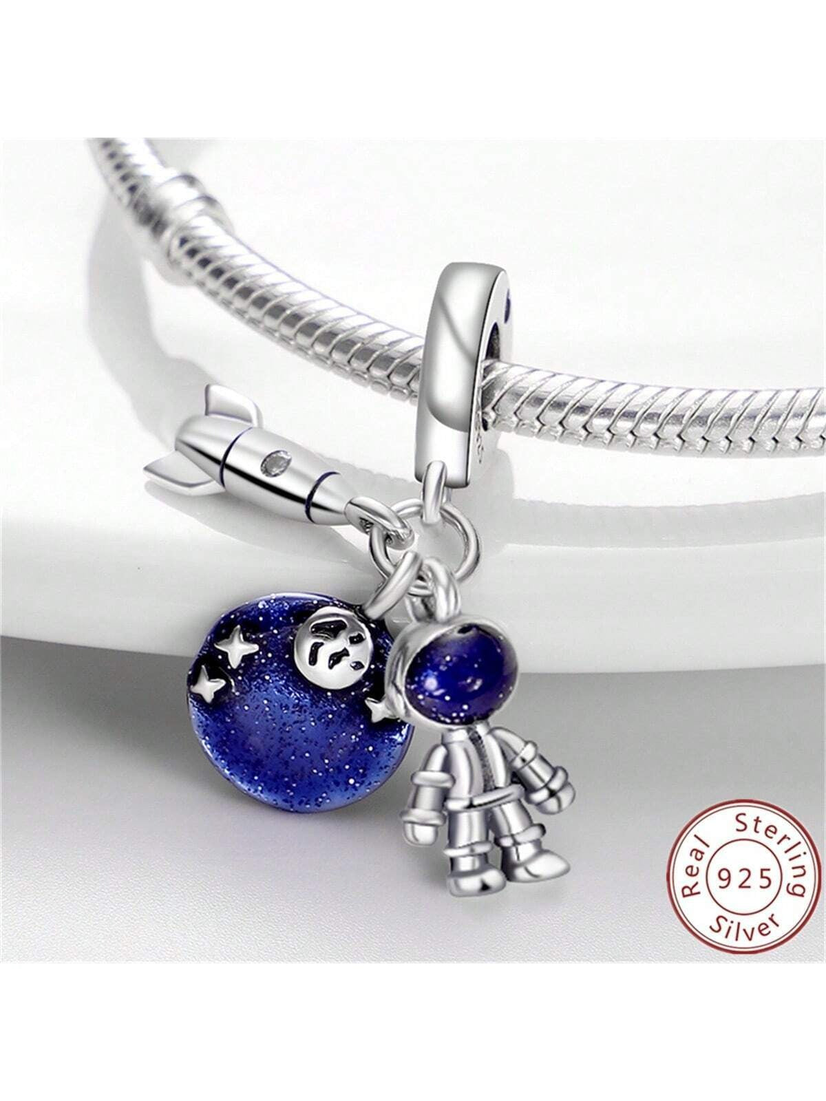 Rocket, Astronaut and Galaxy Blue Space Dangle Charm for Bracelet, S925 Sterling Silver