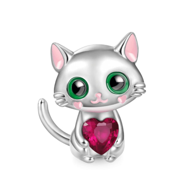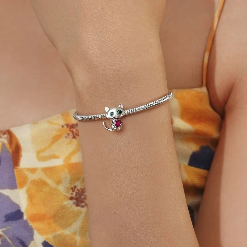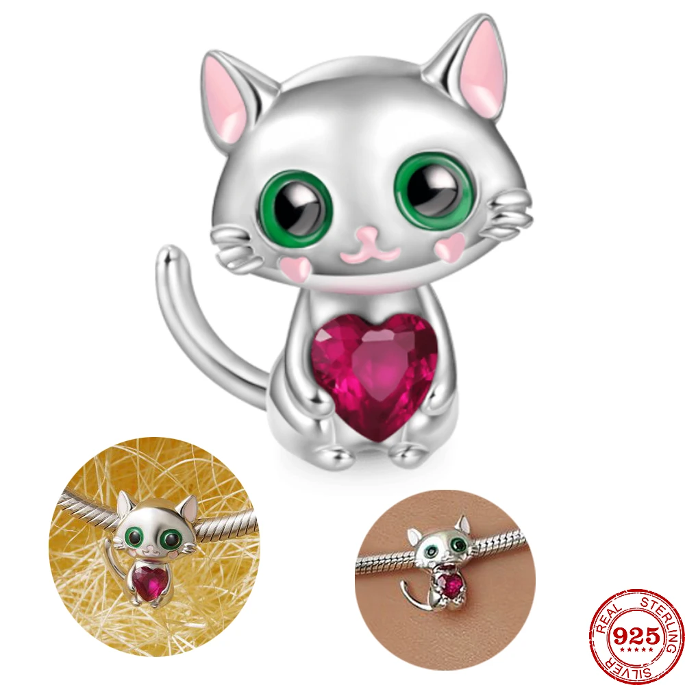Silver Cat with Heart Charm for Bracelet, S925 Sterling Silver