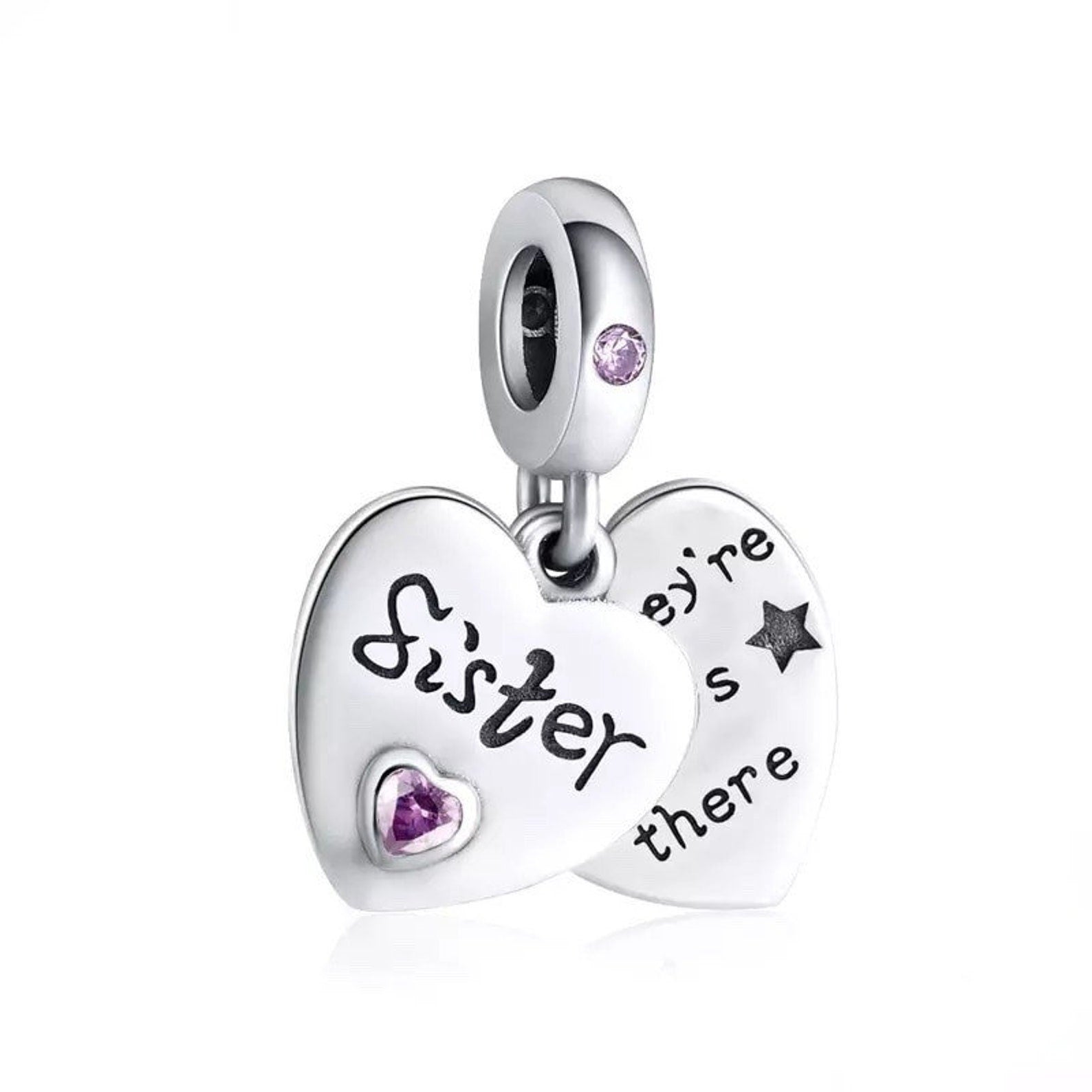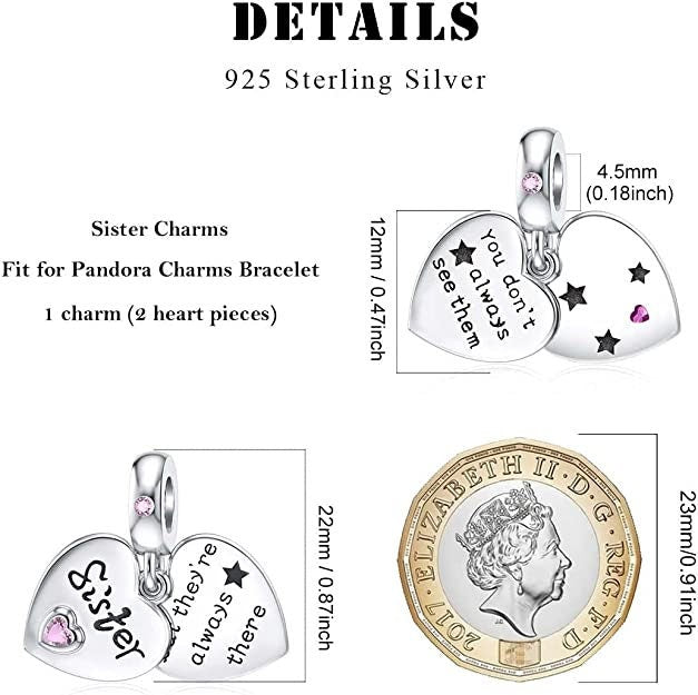 Sister Heart Dangle Charm for Bracelet , S925 Sterling Silver