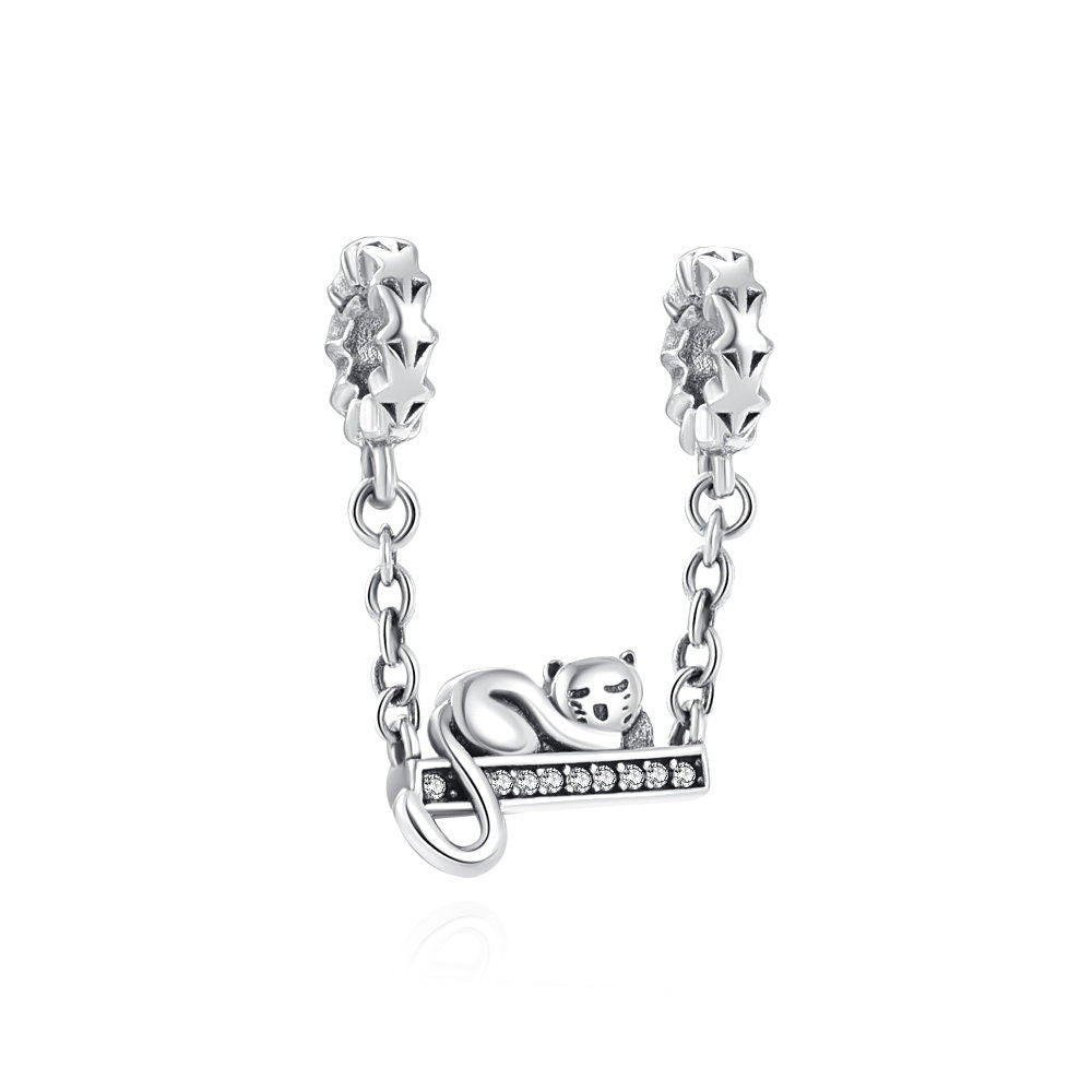 Sleeping Cat Safety Chain for Bracelet, S925 Sterling Silver