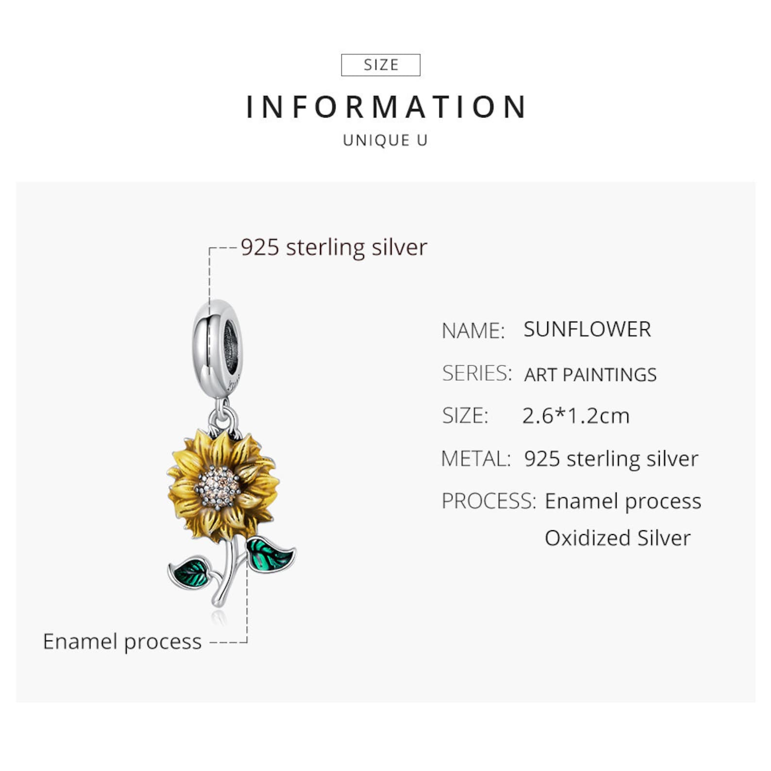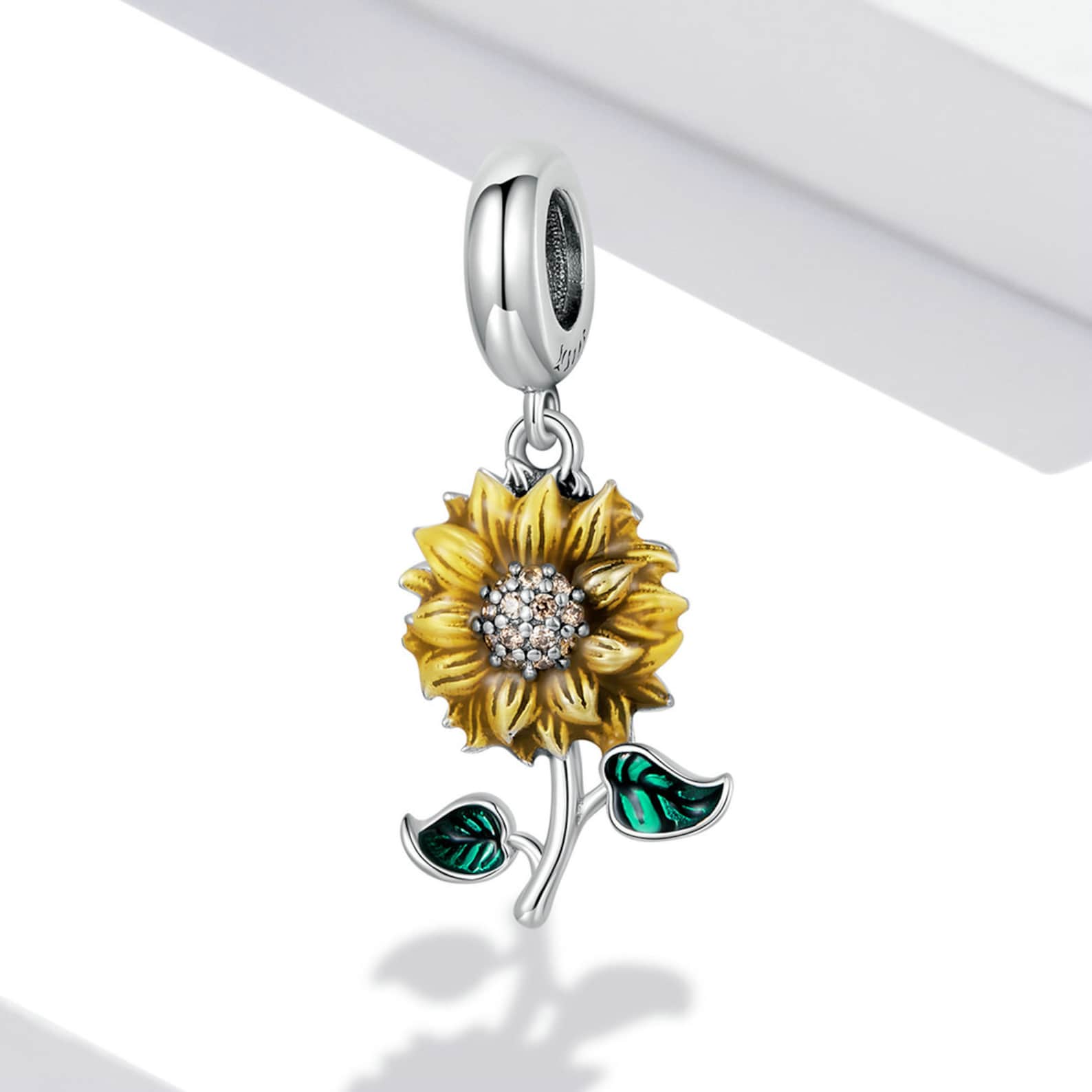 Yellow & Green Stemmed Sunflower Charm for Bracelet, S925 Sterling Silver
