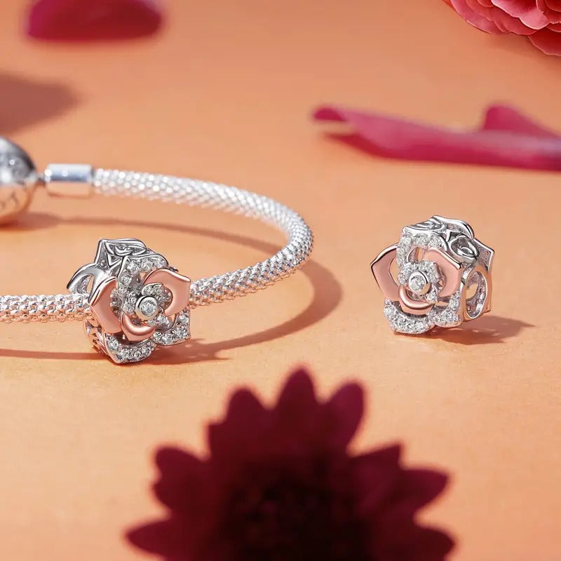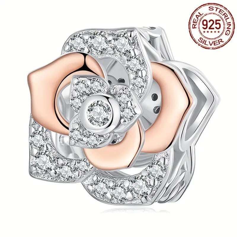 Zircon Rose Flower Charm for Bracelet, S925 Sterling Silver